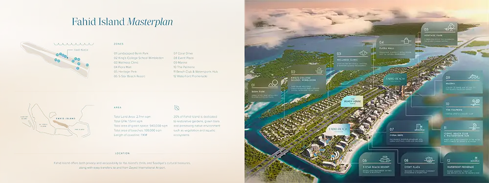 Fahid Island is the UAE’s first residential community fully designed around well-being, with science-backed planning for clean air, walking-friendly spaces, and lush green landscapes. Its prime location places residents just 5 minutes from Yas Island, 15 minutes from Saadiyat Island, 20 minutes from Abu Dhabi city, and 50 minutes from Dubai, blending coastal calm with urban connectivity.
