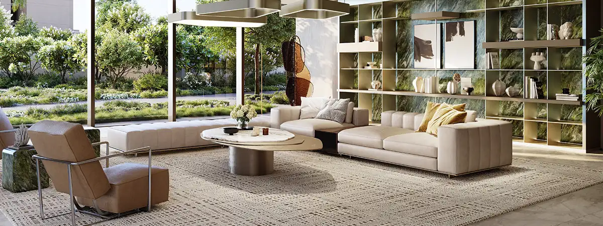 The three 12-storey interconnected towers, with their beautifully manicured gardens and greenery, are a great declaration of a well-designed and classic appeal. The building is designed with clean lines, soft neutral coloring, and robust geometric forms, which are supported by using high-quality materials and minor details. Glass windows and open balconies exposed to the floor allow natural lighting to enter every home and provide stunning views. There is a unique sky bridge between the towers with greenery at various levels, rooftops and terraces - this makes it an environmentally friendly, wellness-centered place to live.