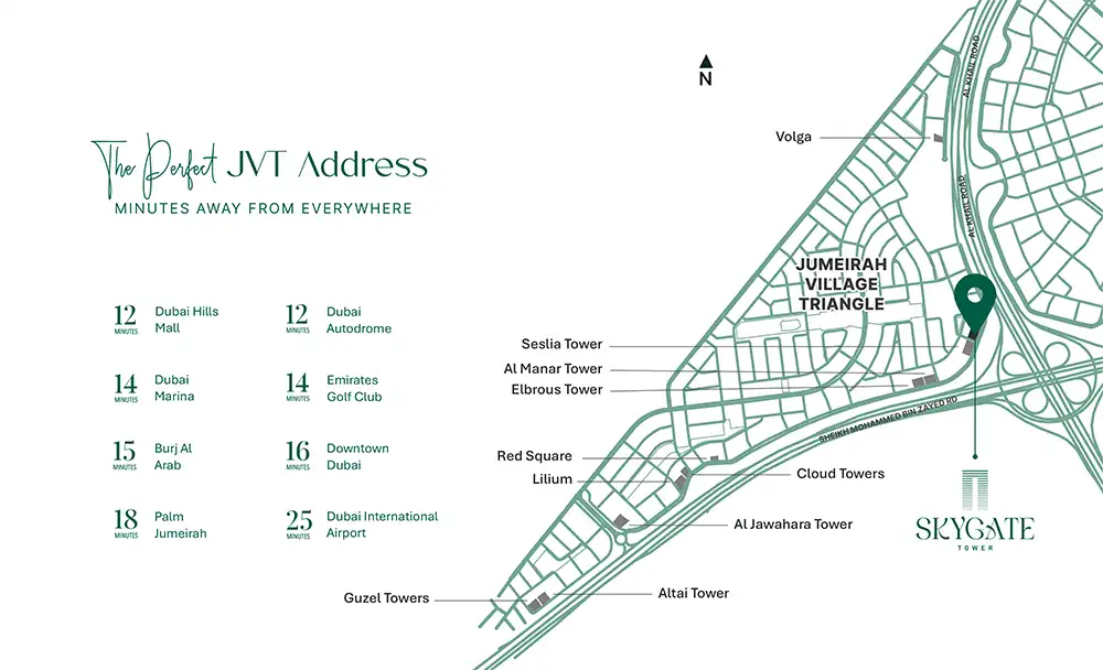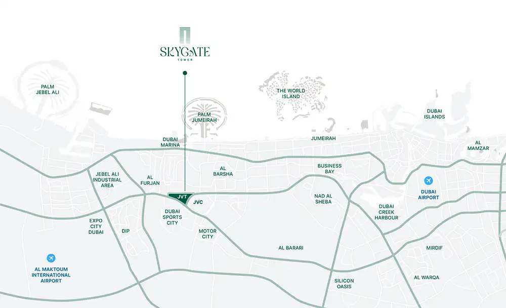 SkyGate Tower by Tiger is best positioned within the flourishing neighborhood in Jumeirah Village Triangle (JVT), where residents enjoy an adequate and convenient lifestyle. In a location that is surrounded by green scenery, the development has easy access to major road networks, including Sheikh Zayed Road and Mohammed Bin Zayed Road. This strategic location enables easy access to key destinations, such as Downtown Dubai, Palm Jumeirah, and Dubai Marina. The landscape is also rich as it has a proximity of schools, shopping malls, restaurants, and recreational centers, which form a perfect combination of comfort and accessibility. The location of SkyGate Tower offers access to the urban environment in a quiet neighborhood.