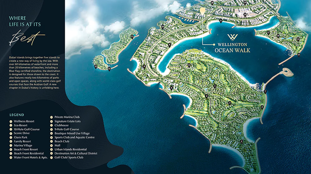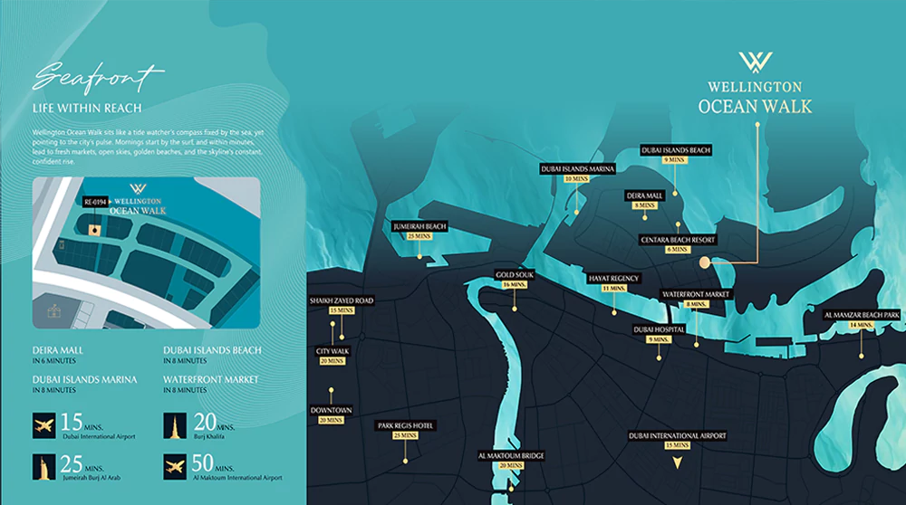The location of Wellington Ocean Walk is an ideal place to be in the midst of the upscale Dubai Islands, which provides residents with a serene coastal life within a few minutes of the bustling heart of the city. It is strategically located in Deira, which means that it is within the reach of major transport routes, and thus can easily access the Dubai international airport, Downtown II, and major business areas. Its location is advantageous to the community due to its nearness to new entertainment centers, waterfront attractions, and shopping centers that will be located on the Dubai Islands. The occupants will have the opportunity to have a breathtaking view of the sea, as well as have easy access to other conveniences in the urban setting. This strategic site benefits daily living as well as provides long-term investors, thus Wellington Ocean Walk is the best place to live in case an individual wants to enjoy a luxury lifestyle in one of the most exciting new waterfronts in Dubai.